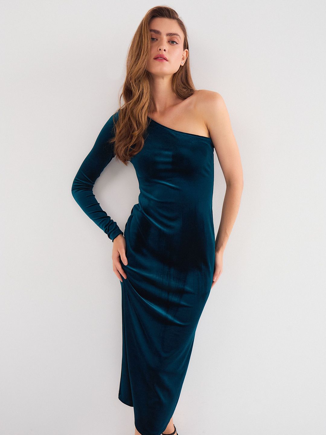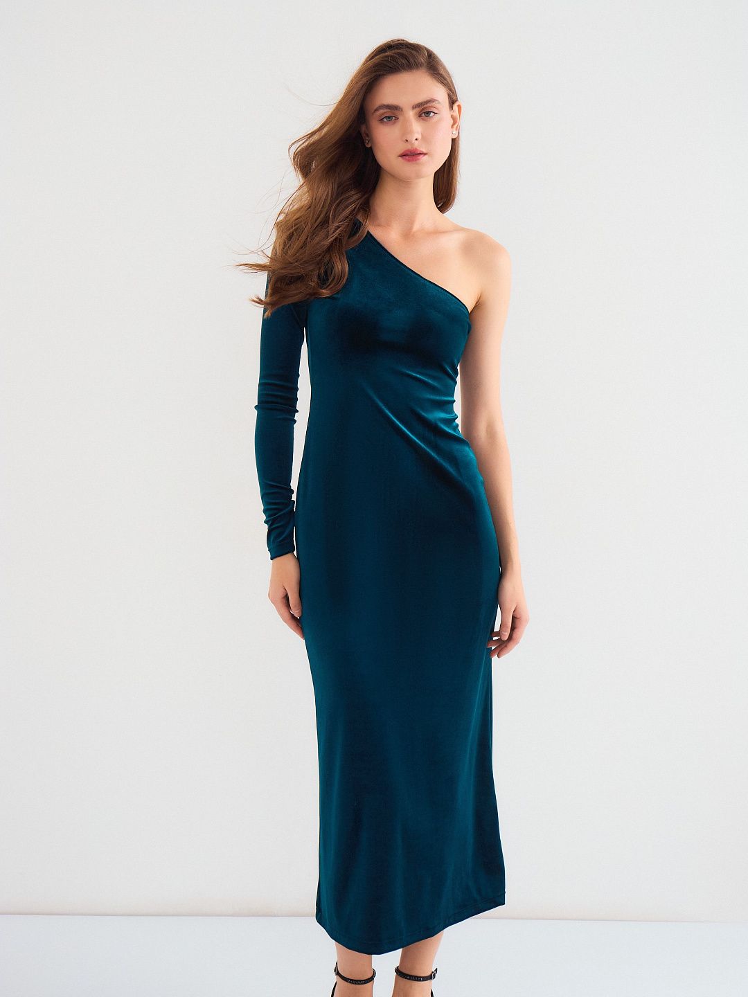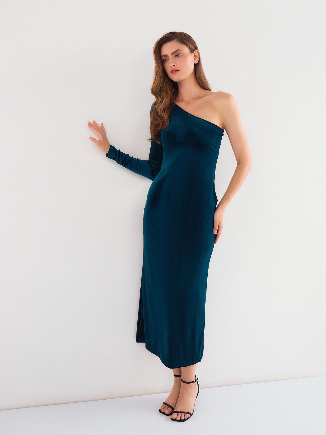 Платье-миди с асимметричным вырезом и длинным рукавом