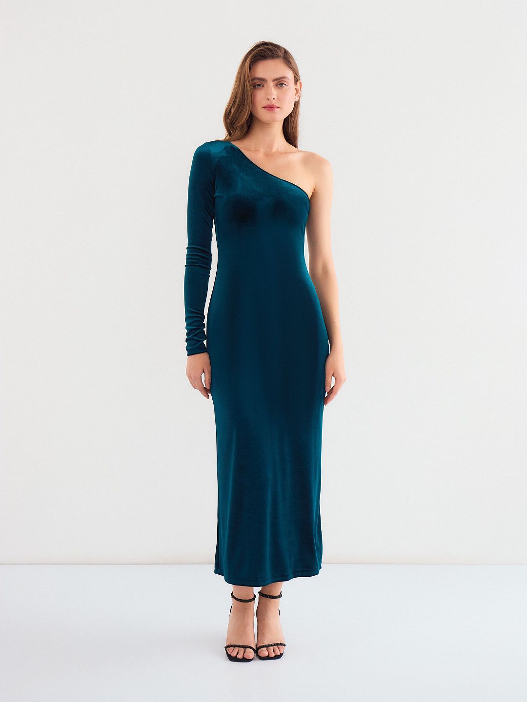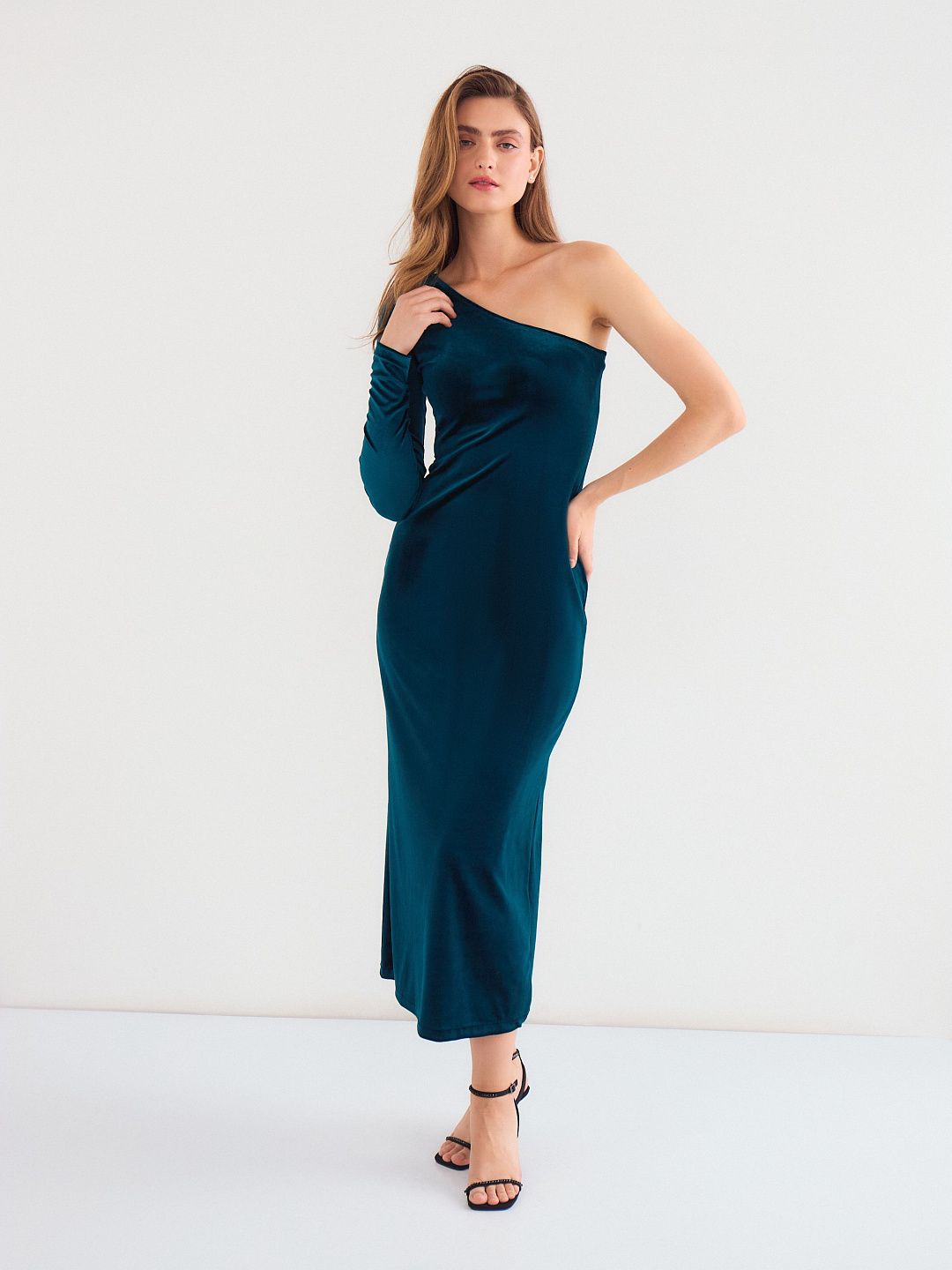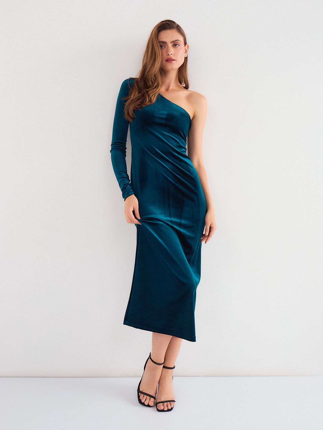 Платье-миди с асимметричным вырезом и длинным рукавом