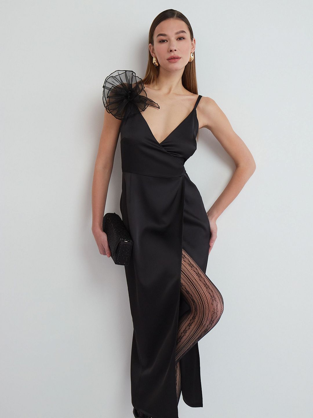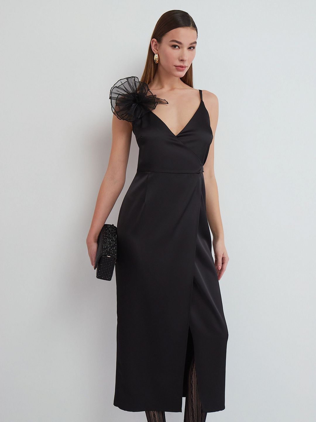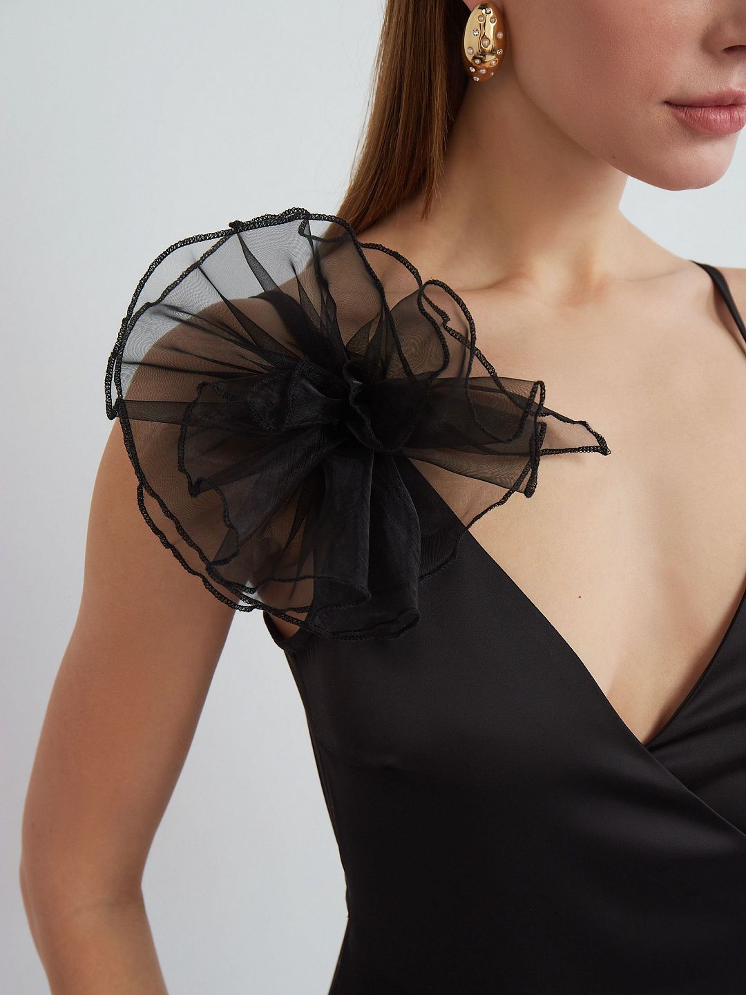 Платьес V-образным вырезом с объемным фатиновым декором на плече