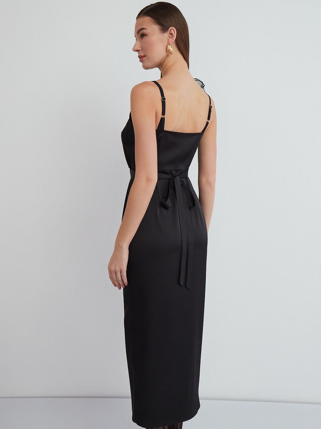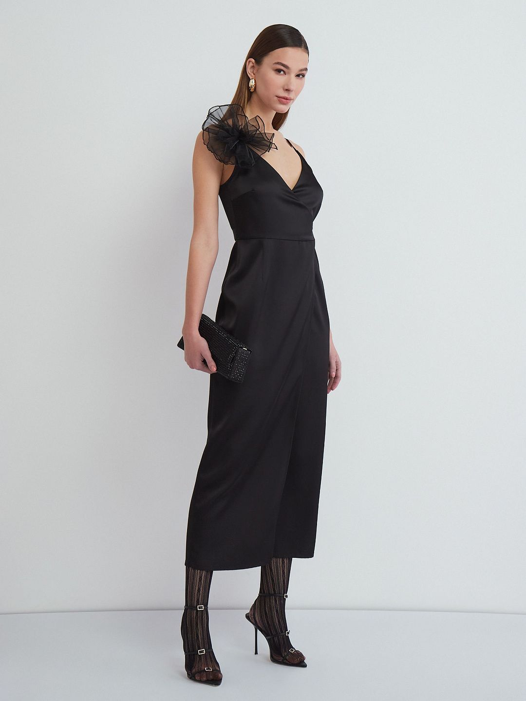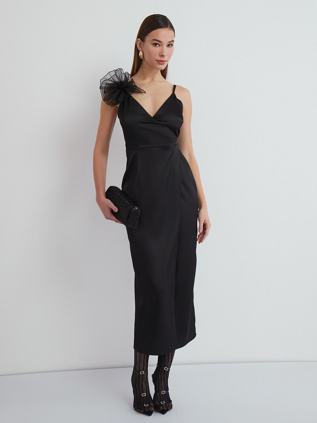 Платьес V-образным вырезом с объемным фатиновым декором на плече